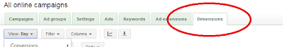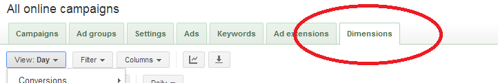 2. Click on dimensions when in the ‘all online campaigns’ view.
